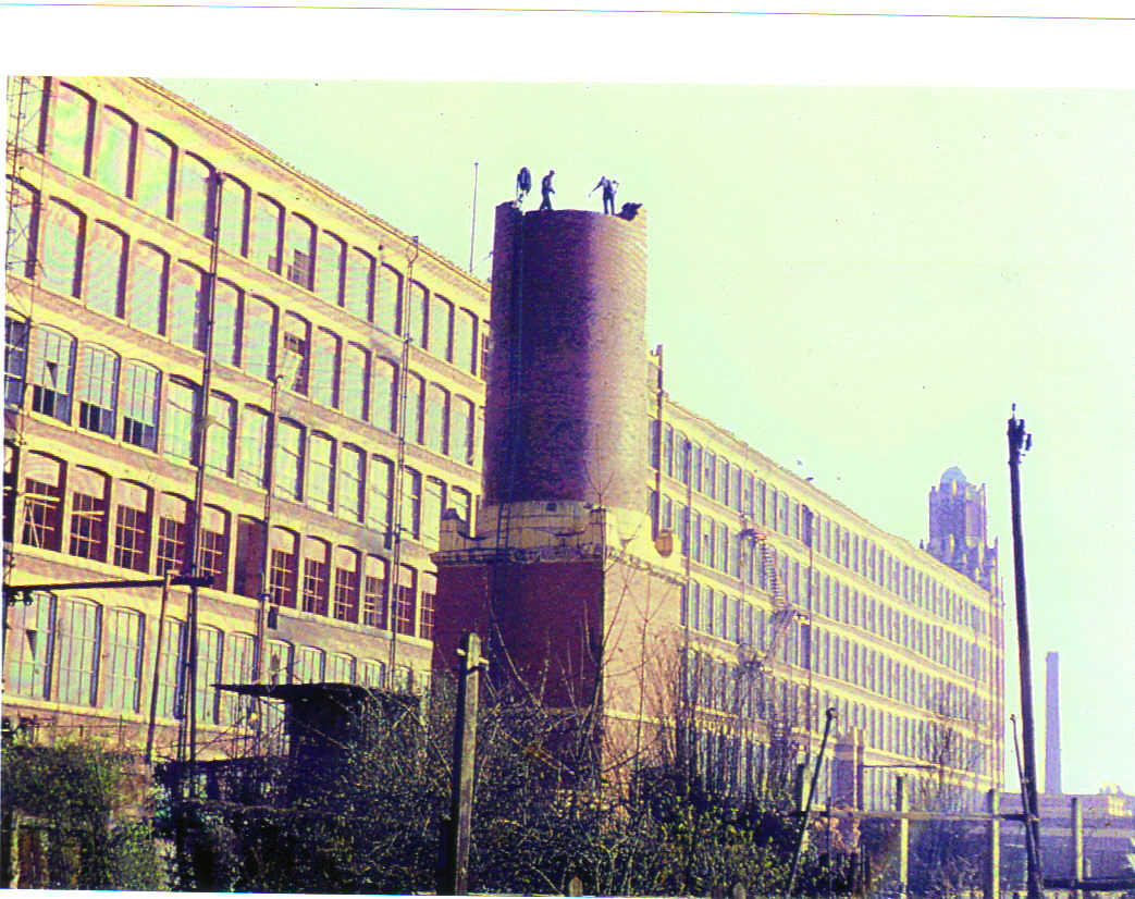 Alan. this picture was taken in 1961. it's Broardstone mill chimney demo by John Devlin , Steeplejacks Dukinfield. Tom/ Fred Schofield. did the pulling down work. the mill is still open lots of small units.