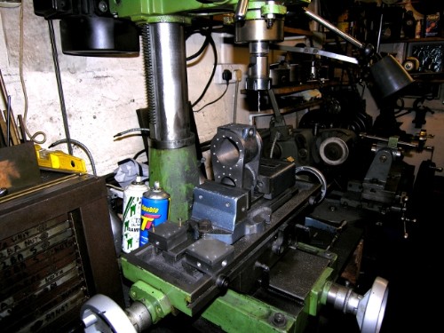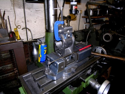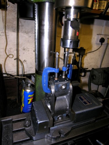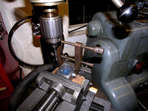 Usual set up for popping the stud hole positions with a long series drill. The only thing that's different is that I dropped the tapping drill inside the bed of the VM. The little gizmo with the red handle is a powerful little magnet on a telescopic stem, just the thing you need when you've been careless!