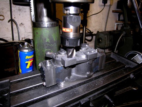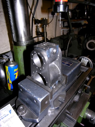 On with the business in hand. I transferred the stud positions to the lid and used it as a template for drilling pop marks in the block with a long series drill to clear the clamps.