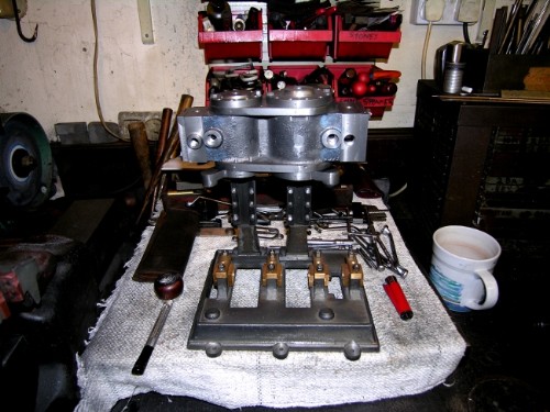 I thought about it this morning as I was looking at the partially completed engine and mulling over the tricky little job of making the fit between the front supports and the lugs on the bottom lids, the bed end is easy, mill the pads to the correct angle and something like a quarter Whit stud machined on the bottom of the standard with a wedge washer under the bed to get the pull square.