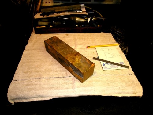 A good start. Some measurements and a bar of cast bronze that Dick Bonser poured for me many years ago. God knows what this would cost now! Only slight question is that it might be aluminium bronze, the hardest bronze of the lot and as tough as old boots. There again, I could be mistaken. It will certainly do the job! A bit of sawing on the Harrison HM will be a good start I think... I wouldn't like to have to saw this by hand!