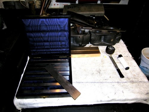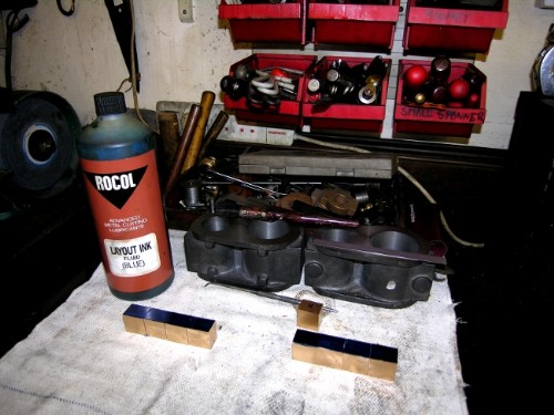 Popped in last night to blue the blanks so they mark clearly. Two sorts of layout ink, blue for clean shiny surfaces and white for rough castings. Helps to make marking out lines clearer.