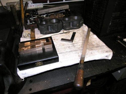 Once they are all reamed, pop them into their mating pedestals and pop the reamer through again to make sure they are in line. A bit of hand-filing at this point to make sure they are all sitting dead level. Remember the bed castings can distort slightly as well at this point. You can never get castings dead accurate.