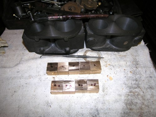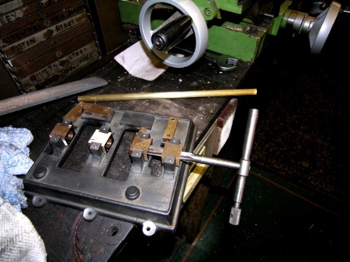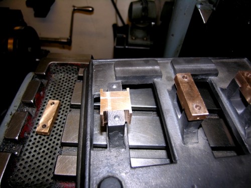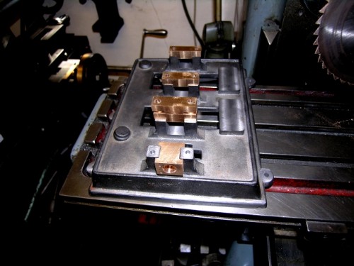Close of play at noon. All the blanks bored and mounted on a piece of 1/2" brass bar. I don't know whether you can see the marks but I have kept the two sets separate becuse there will be small variations between the two and the next job is to mill the blocks so they fit into the pedestals with a lcating edge at each side. This will become clearer shortly.