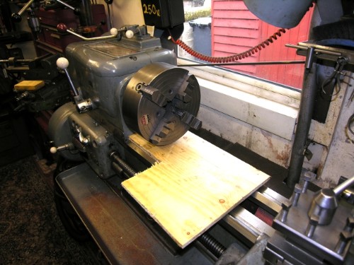Setting the blank up in the two jaw for boring. A piece of HS steel as backing to ensure it's flat and true. Wind the centre forward to coincide with the centre you've marked and nip the chuck up. Ready for shaving!