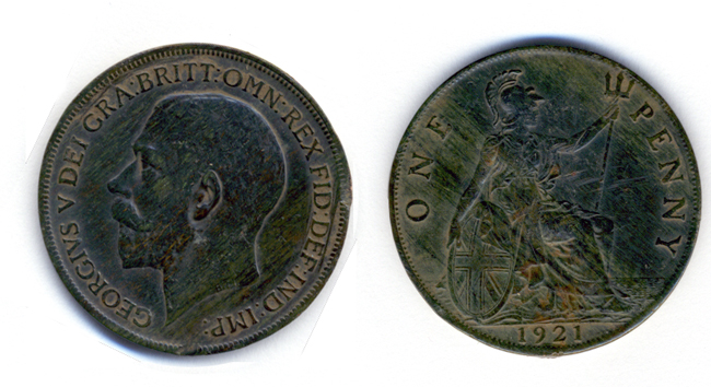 Here's an old George V penny with a 1921 date. We believe it is one of the "low tide" versions which, if it had been in mint condition, would have been worth £50+. Dug up near Giggleswick. Anyone got any idea of what it's worth?