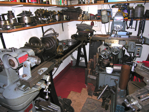 Well, we've made a start! The first job was to rearrange my assets and get some room under the lathe, then a cleanup and a coat of floor paint. It's a lot easier to work if things are clean. A good thick coat of floor paint can hide a multitude of sins. There's enough room behind the bed at the tailstock end to mount the Horace Green motor on the floor, take a drive up the back to a countershaft mounted on the wall and thus get a drive to the mandrel. I shall have to take the shelves down and put them back up after the countershaft is sorted out. I shan't need any big pulleys on the first motion, the motor does 1450rpm and I'll aim to have the countershaft running at about 350rpm, without working it all out I reckon this will give something over 1000rpm for the top spindle speed. Of course I'll check this. Funnily enough, once the countershaft is mounted I don't think there'll be a lot to do to get running, the lathe is in better nick overall than the 1927 was, it has a massive set of gears and the tangential dividing is already built into the headstock. Enoughg lifting for one day, I've taken a couple of the red pills and will now take it easy!