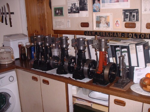 Posted - 22/12/2007 : 16:53 Doc came down this afternoon and we played out in the shed. We ran the 20 year old engine and then the two new small ones just to start the running in process. The valve and the first one wasn't seating quite right but it ran and this will soon sort itself out with a bit of running. Available light so you can see they are running. Here's the line-up onj the kitchen bench, all except the red framed one made this year..... not a bad score. There is more.... I got the instruction book out for my Nikon Coolpix and we nade a video which Doc is going to put up on the site. Making steam engines is good and interesting but the most exciting bit is when you first put steam or air on them and they go like hell! Very satisfying making inanimate bits of metal come to life! Doc and his little helpers sorting the video out. He tells me it will be up on th site very shortly....... A nice day.