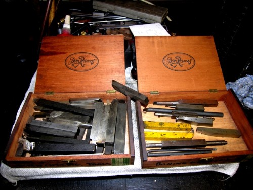 First job on the cards today was making studs for the pedestals. Nothing looks worse than ragged ends on studs so first job was to find a form tool for rounding the ends. Over the years you have a lot of little jobs like this and make specially shaped tools to deal with them. It makes sense to keep them togther, easier to find next time. My late friend John Martinez smoked good Cuban cigars and gave me his cigar boxes. Just the thing for the specials. The box on the right is for boring bits and the one on the left is form tools and screw-cutting. Keeping them tidy saves time!