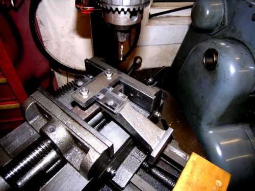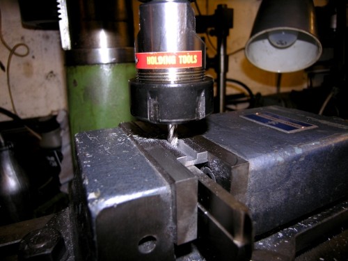 Still firmly held in the clamp and the end holes in each guide are drilled tapping size centrally through the clearance holes. Its a number 40 drill. Number drills are old-fashioned nowadays but were made to wire gauge which is the best tapping size for small screws.