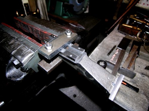 Here's the pic of the clamp that I promised you yesterday. It lets you make sure that the alignment and spacing of the guides is as good as you can get it. God knows I need all the help I can get! Rwo bits of srap and two 1/4" Whitworth bolts. In case you didn't know, Whitworth thread was designed specially to give the best hold for steel threads in cast iron. It's never been improved on and I stick with it! British Standard Fine was developed for steel on steel. One other little tip, a set screw in cast iron has maximum hold when the engaged thread length is 1 1/2 times the bolt diameter. In steel it is the bolt diameter. A rough guide but it works.