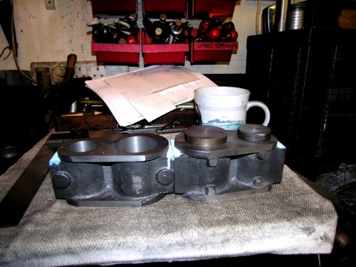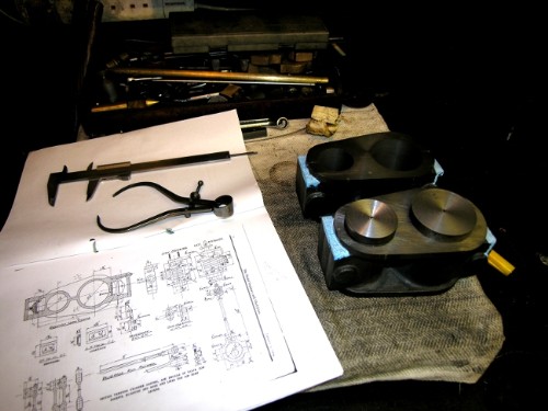 The good news is that initial rough measurements indicate that the eccentrics can be aligned dead accurate with the cast apertures in the bed. Johnny got it right even if the ME didn't! Incidentally, the plug in the LP bore is CI and so could very easily become the piston. These plugs are going to come in useful for another purpose, locating the blocks for machining of the external faces on the block......