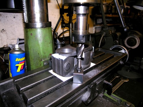 Cylinder block clamped down on the bed using the specialised fixture set. Bit of a luxury this, you can make your own but not as good or versatile as the purpose-made sets. First job is to mill the sides of the edges straight and clean.