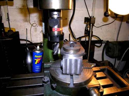 Remember what Robert said about tools for the job? Here's the rotary table, a very useful piece of tackle. Clamping the block down central using the plug means that once the table is set up in the right position, you can rotate the casting against the milling cutter and get a dead accurate circular cut round the end of the block at a depth deep enough to clean up the top side of the valve chest base as well. There's no other way I know of doing this job, making an interrupted circular cut. The table can also be used for drilling hole on a pitch circle, say for stud holes in the blocks or the lids. It will also come in handy for milling the bottom lids of the cylinders which have a projection on the side to match the tops of the standards and which is used for attaching the block. We'll come to that later. Mind you, because I have two ornamental turning lathes with built in tangential dividing gear I can go at this into drilling on pitch circles in more than one way. I might have a play and treat you to more than one route to this so you can decide which way you want to go. One thing is certain, the use of dividing gear is far more accurate than marking on a PCD and drilling. We'll come to that later.