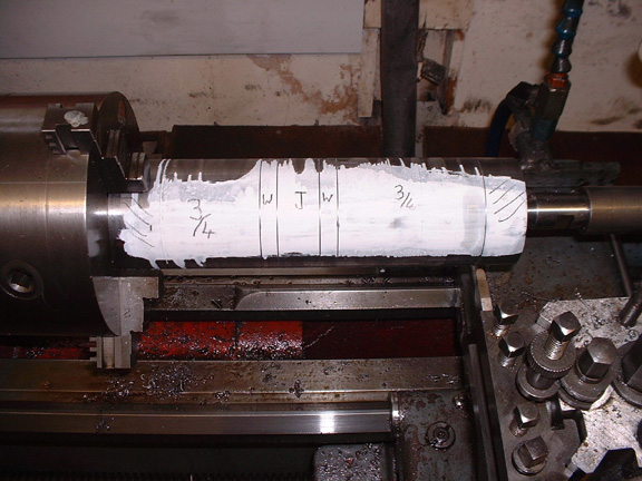 The first one mounted in the lathe. I've marked the cuts with a sharp tool and for the benefit of the onlookers have marked them so you can see the cuts to be taken out. The two ends shaded with pencil stay intact until the shaft is finished because they have the journal and eccentric centres on them. 3/4" is the shaft at each side. W is the webs which stay in to make the counterbalance weights and J is the journal for the con-rod.