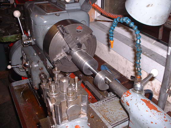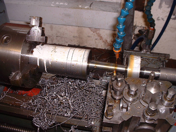 About 4pm after a full day.... The final cut coming off the first section of shaft. It's slow work. If you put the speed up the swarf is coming off red hot and the shed is full of smoke. I had to drop the speed to 119rpm. I was taking 40 thou a cut, any more and it was blue swarf again. If you think about it, on a six foot swing lathe with a big workpiece this is about 3/8" cut which would be fairly heavy so no wonder they took as long as well.
