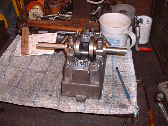 Nice quiet morning finishing the shaft and fitting it. The RH journal in this pic needed adjusting a touch but otherwise, a nice fit and perfectly acceptable. It struck me that a bit of a word on fitting bronze bearings for steam engines might be useful. In the bearing itself, one of the biggest sins is to fit too tight. Ideally, there must be enough clearance (slack) in the fit to allow the oil to build up a wedge. If you don't do this you can't get full film lubrication because the bearing clears the oil out and you get boundary lubrication which equals accellerated wear. The old fitters knew this and always allowed for the wedge to form. They also cut gutters in the bearings to make sure the oil was distributed evenly. On a small bearing like this one there is no need for gutters, we aren't driving 300 looms! Another common mistake is to omit side float on the shaft. Watch any large steam engine running and you'll see that the flyshaft is floating gently from side to side. On a big rngine like Ellenroad it was about half an inch. The reason for this is that no engine is so perfect that it rotates dead even and perfect and the side float allows the discrepancies to be soaked up in side float. There is another advantage in that this means that bearings wear more evenly and have less tendency to become roped. I have always suspected that this float aids the migration of grit out of the bearings as well. Last but not least, make sure there is plenty of clearance between the radius at the end of the journal and the rounded shoulder of the bearing brass. On large bearings you will often find that they start running hot in old age which can be a puzzle because there is plenty of clearance in the radial fit. This almost always down to the brasses spreading slightly over the years and the point of contact is between the shoulder of the journal and the edge of the bearing. This will happen over the years and if there is an adequate amout of side float it will be much longer before this happens. I don't know why people are afraid of side float because the shaft isn't going to go anywhere, once it settles in the dynamic balance of the recprocating parts will hold the shaft in its natural centre and it will never be restrained by the bearing. The same applies to the bearings, pedestal bearing never knock with a small amount of play. If ever they do, it's more likely to be a fault in the valve set up, too much compression or something similar. If you watch any large engine running you will see that the bearins are breathing slightly, again, this is the dynamic balance finding the right centre. If you get all the fits perfect and restrain the bearing rigidly you will be stopped with a stinking hot bearing inside ten minutes. Far better to hear them than smell them!