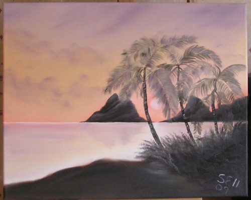 Restful is the effect I wanted. The picture we were working from was brillian oranges, violets and blues... just not my colors at all. However the scene was... back to water hills and trees. I think I am beginning to find that this is more my style than buildings or people.