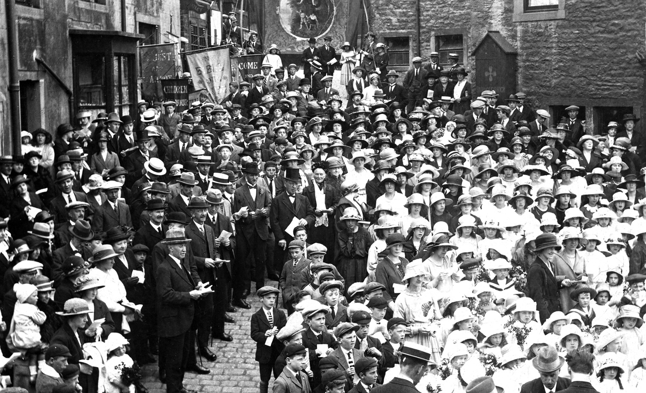 A gathering on Jepp Hill in the 1920s? Looks like part of the Whit Walks. Lots of interest on the picture. My favourite is the small sentry box on the wall. This was a board for laying out a dead body on before rigor mortis set in and was provided by the St John's Ambulance.