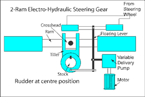 There are a few common arrangements for using hydraulic power. There are the 4-rams, 2-rams, and rotary vane types. The heart of these hydraulic systems is the marine steering gear, rudder, stern, hydraulic, electrical, power, telemotor, fluid, ram, direction, feedback, Marine Engineer Shipping variable delivery pump. This type of pump can be controlled by just moving a spindle. The pump is driven by an electrical motor at constant speed. By moving the control spindle away from the central point, the pump stroke increases, and the hydraulic fluid is pumped in one direction. Moving the spindle more from the central point will cause more fluid to be pumped and consequently more pressure is generated to drive the rams. Moving the control spindle back to the original position and then away in the opposite direction causes the hydraulic fluid to be pumped in the reversed direction. The rams will also move in the reversed direction.