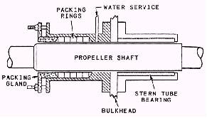 One of the other watchkeeping duties is to monitor the stern gland. The stern gland is the seal around the propshaft, where it enters the stern tube. Seawater seaps into the stern tube from the propellor end of the shaft. You cannot have conventional bearings, because of this seapage. To overcome this problem the sterntube is lined with Lignum Vitae. The stern gland has a collar on it that compresses the Lignum Vitae bearing, and creates a tight fit around the prop shaft in the stern tube. However a little sewater needs to be allowed to pass through the stern tube to act as a lubricator. The stern gland is also lubricated by a non emusifying lubricant that is pressurized and lubricates the inside ege of the gland. Usually, when the gland is adjusted properly (this is done by either tightening or loosening the nuts around the collar) there will be a slight trickle of seawater running into the tunnel bilges, these are usually pumped out on every watch.
