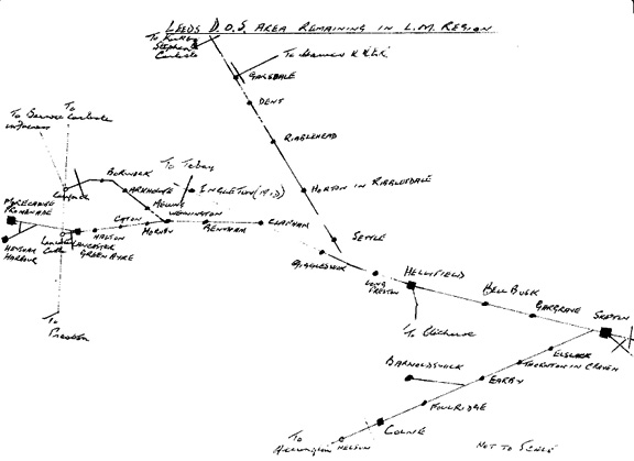 Apart from a small value as a diversionary route for the main line, there was little non originating `through' traffic over the Ilkley Line. A three times out and home working Starbeck- Rose Grove during the war had got down to one a day by 1950. After I left Skipton in 1951 there was a tanker service between Teeside and Heysham using this route. The Sunderland - Blackpool SO service in 1947, I mentioned earlier in this document, was later replaced with a Saltburn - Blackpool. I also worked at these other stations in the district, Methley (i/c Altofts and Whitwood), Woodlesford (the only station I ever felt out of my depth when having to charge ale and porter), Newlay and Horsforth, Calverley and Rodley, Apperley Bridge and Rawdon, Baildon, Steeton and Silsden, Earby (i/c Thornton in Craven and Elslack) and Caton (i/c Hornby).