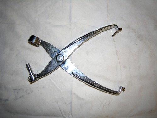 Top one is very similar to an eylet crimper, although having a finish in what looks like stainless or chrome plate. They could be medical or veterinary impliments maybe. The handle on the top one look to have a lock mechanism as well to fasten when shut.