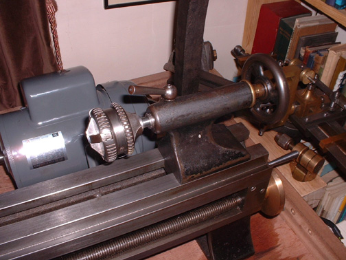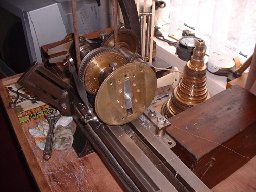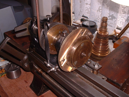 My interest in all this is Johnny and the two lathes. If it drags me towards OT I shall resist it because I'm not into fiddling for the sake of fiddling. A bloke asked me the other day what was special about it and I told him that the best way to describe it was that you could take something round and make it flat! He seemed to be satisfied. As a matter of fact Johnny only delved into OT once, he made a table lamp and a cylindrical tobacco jar and incorprated most of the things the lathe would do. He then dropped OT and went back to what he wanted the lathe for in the first place, a handy and well-built screwcutting lathe with the ability to do light milling and gear-cutting for his clocks. He used it until 1950 when he got into turret clocks and needed a bigger lathe so he built the 12" lathe and gave this one to Newton. By that time he had a Myford and a round bed Drummonnd which he fitted up to some fancy screwcutting like fusee scrolls for his mates. Newton said that amateur clockmakers used to come up from London to collect scrolls that Johnny had made for them. Johnny was like that, he'd do something for the challenge and then lose interest. He made a set of epycycloidal chucks for the 1927 lathe and I think one for the 12" as well, as far as I know they are buried in the SM at South Ken somewhere. I know they existed because I've seen pictures. As I mentioned when I was on about the lathe on OG he made all his worm wheels for dividing 180 teeth and it wasn't until I got into it I realised he had clocks and dividing scales for microscopes and telescopes in mind.