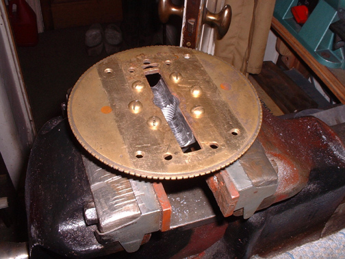 This is where an overhead drive comes in really handy. The rivet holes for fixing the plate to the boss are haphazard, there is no rhyme or reason to their placing and using this set up it's easy to drill a centre hole in each of the locations.