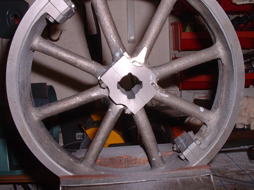 Back onto the flywheel..... I've decided what I want to do with it now, mount it on a sgaft and bearings and set it up on a wooden support. I might put cranks, eccentric and governor drive on it. Here's the wheel as I filed the stake beds out. The top one is to do next, the bottom one is cut and the stake drives from this side. The other two are the tail ends of the beds which drive from the opposite side.