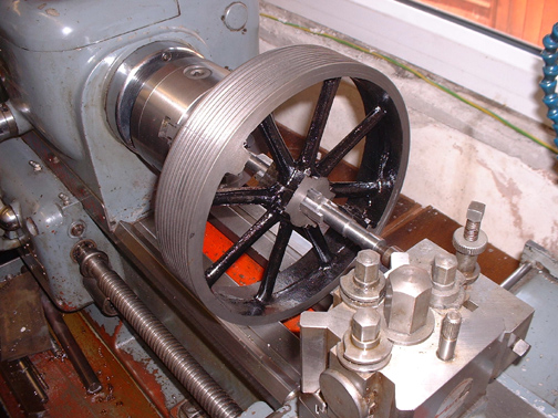 I've been having fun today! Here's the flywheel on its shaft in the lathe getting staked on. Anyone who is really observant will notice that the toolpost is different. This is a Harrison toolpost that acceots toolholders already set for height, a great timesaver but one I have never used much. It came into its own today because one of the toolholders accepts Morse taper and so it was easy to centre the flywheel without using the tailstock which would have meant the saddle being in the way. Of course I could have taken the tailstock off and remounted it indide the saddle but this was easier. The stakes are in and in theory all we have to do is true the wheel using the stakes.....