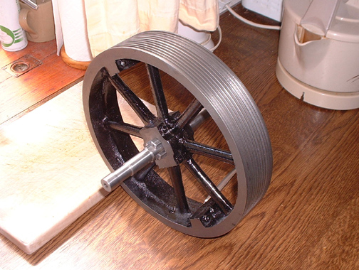 Here's the flyshaft ready for having the flats for the stakes machined on it. The slightly longer shank at the left hand side is because as well as the eccentrics, this part of the shaft has to carry the governor rope drive pulley as well. The stakes are rough machined and I've given the flywheel a coat of black paint.