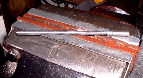 Here's a sad little picture and an awful warning. The cutting frame needs a lead screw to adjust the cutter so I decided to do my best and make it out of silver steel. If I want a really good finish on the thread I screw cut it in the lathe to almost full depth and then run a die down it. That's how I made this and when I'd finished it had developed this interesting but disastrous bend. I must have left a bit too much metal to cut with the die and being silver steel, it is tough and being slender, the torque twisted the core and produced the bend. Ah well, back to the drawing board and we'll take more off in the lathe.