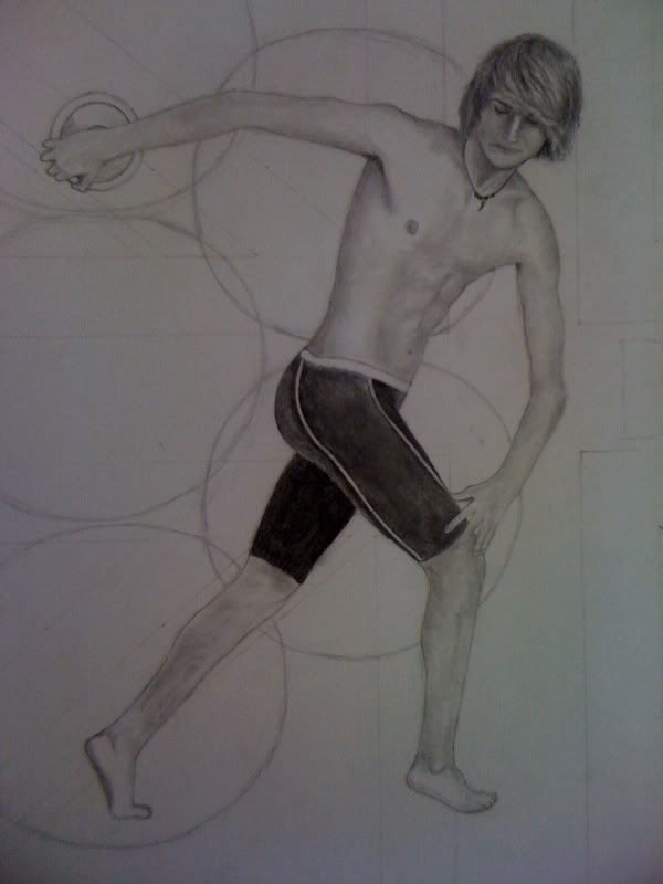 im off to learn how to use coloured pencils tomorrow as ive had alot of requests for coloured portraits. so i think i am going to have an interesting day as ive been told i will be the youngest by a mile!! haha well the old grannys will be spoiling me LOL and today was the end of my 10 hour gcse art exam, this time i drew myself throwing the discus with the olympic rings behind me and a union jack. the artist that i used for this piece was the offical olympic artist kevin whitney, so thats where the union jack and the olympic rings in paint came from, with my bit being the self portrait in pencil. ive got a sneeky photo of how my exam work was going yesterday, i havent got one finished but you will get the idea