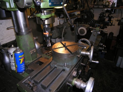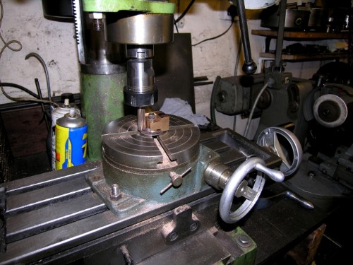 Many years ago my mate Paul at Rochdale Welding had his van stolen and lost all his tools. I had more spares than you could poke a stick at so I had a quick trawl and found him a bunch of good basic tools to get him going again. He never forgot this and occasionally he'd turn up with something for me. One day he brought in a 6" rotary table in good nick and asked me what it was and whether it was any good to me. I grabbed it of course! Now, the funny thing about it was that it had no central threaded hole for a locating set screw and over the years, whan faced with rotary milling on items with a hole smaller than the 3/8" hole in my other table I have had to make fancy studs to get over the problem. Yesterday I bit the bullet, stripped Paul's rotary table down and drilled and threaded the centre for a 1/4"Whit socket head screw. Just right for milling the radius on the crossheads. God knows why I have never done it before, took far less time than making a special stud and far better.