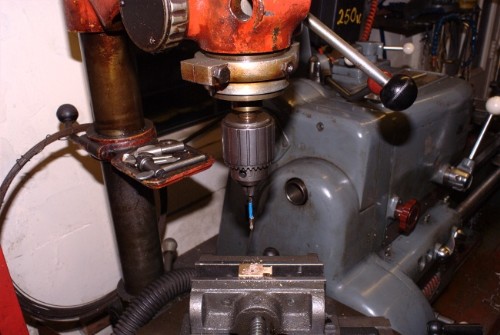 First job was to poke a 1/8" drill 5/8" deep to preserve the location of the piston rod attachment when the pop mark is milled off. Bleeding obvious tip, an easy way of drilling successive holes to depth is to put some insulting tape on the drill. You can get specialised drill stops but this way is quick and easy.