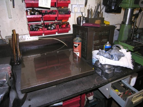 All right, I'm obsessive about cleaning up! I had a good clean up, washed the dirty table cloth and laid a new one. I always spray the surface plate with WD4o or similar when I clean it. If you don't, you'll find rust on it when you need it! I can hear Newton laughbing at me!