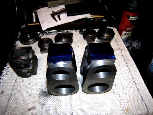 Once all the edges were milled, some careful filing dealt with the irregular surfaces. Here's what the rabbit looked like after the first pair were done. I've made the lids a bit thicker than Bahrett did. My rule of thumb is that they should be as thick as the cylinder walls. By the time I've finished this engine would stand 250psi easily.
