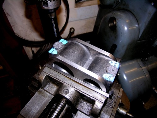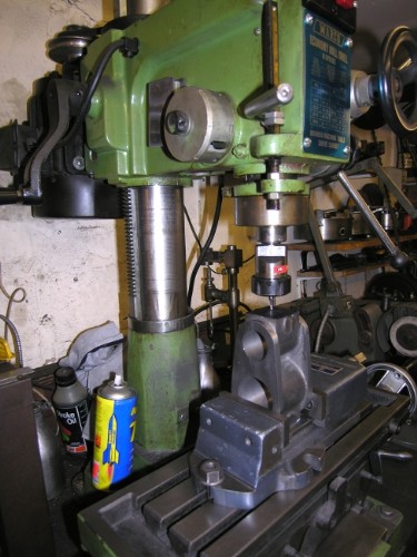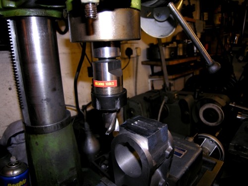 Last part of the valve ports was to get the exit holes drilled and tapped. First stage was a bit of careful measuring up of course, some marking and a ventre pop. Then poke a 3mm drill through into the valve ports, if that's nicely in centre, drill for the exhaust pipes with the 29/64" drill on the VM for rigidity and accuracy. Then back under the pillar drill and poke a 1/4" drill through into ther valve ports.