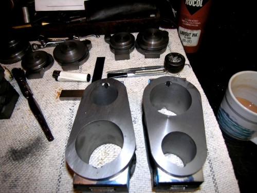 Close of play. I haven't filed the rough edges up on the left hand cylinder. I decided that while the rotary table was on the miller I'd mill a flat face on the bottom of the lids for the PCD of the holding down studs. The blocks are upside down of course. Made a few check measurements and by a miracle the lids are centred properly, the faces for attachment to the standards match the centre lines and the tabs for the support pillars are on the right centres. Even more of a miracle the levels of the attachments match across the two blocks. Not important of course, they are different engines but at least it shows some consistency, one of the advantages of building two engines together.
