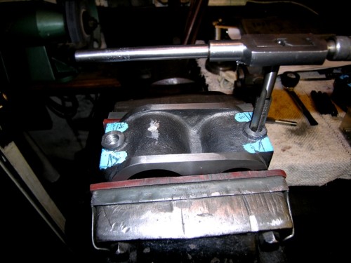 I decided the first job was to tidy up the face of the valve ports. Sharpen a cutter, get set up square and take the merest skim off the faces to get rid of the scribing marks and make sure the faces were flat and square to each other.