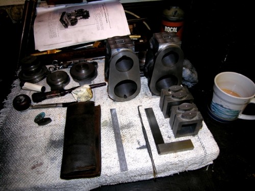 Close of play at noon. Valve faces done, all steam chests cleaned inside and some sides milled square and parallel. This morning will be finishing the valve chests to fit the valve faces and sorting out the material for the lids. This is a nice stage because after a lot of work on the blocks and castings you suddenly realise that you are getting close to stud fitting and valve making. The end is not yet in sight but we are a long way down the road and the magic of the shed is getting near to producing two working engines. Lovely stuff and very good for me! Notice that I am on the same course as newton was when he was making the traction engine cylinder above. Get the cylinder assembly finished before you start to address the union between it and the rest of the engine. Good to tell who taught me!