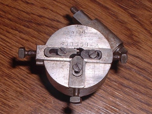 I have a bit of a puzzle. In my treasure chest are many weird and wonderful tools harvested over the years and I can put a name and a use to most of them but here's one that has me beat. It was made by Brown and Sharp, Providence, RI and has a number on it, I think the first part is the size 'No,. 00. Then 53558 - A. On the back is a parallel round spigot and there is a hole right through the middle of the tool. Anybody know what it is or what it's for?
