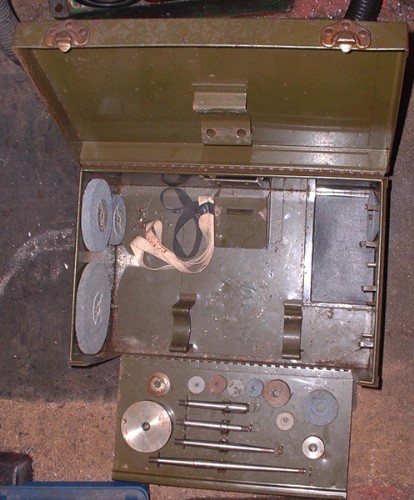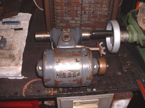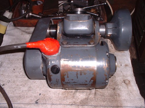 Here's a different kettle of fish. It's a Dumore toolpost grinder that dropped into my lap many years ago and I've never really looked at it. It's a bit of a goody, motor does 15,000rpm on 115V and spindle speeds vary from 45,500 to 4,500 rpm by different combinations of the 4 pulleys. The driven shaft was siezed by sticky oil so I've freed that and given it a good dose of oil, same for the motor bearings. I'll let the oil soak in for a few days and then go back to it. I have a 110volt transformer and so no probs with the voltage. A high class bit of kit for specialised jobs. Time I had a play with it!