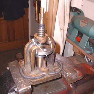 Here we are, the gland plug is made and fitted and we're ready to insert the proofed carbon gland packing in the space bbetween the valve head body and the spindle. Notice how they are cut into individual rings and not just wound round the spindle. Once you have five rings in the gland plug is dropped down and screwed down by the gland plug.
