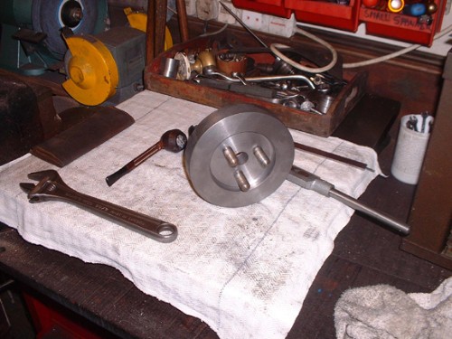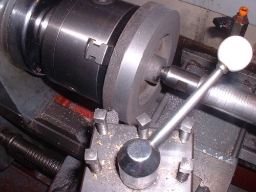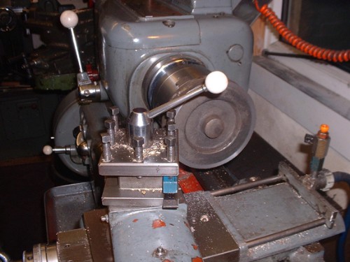This is one of my obvious pics. If you already knew this, skip to the next. Castings are funny little beasts. Apart from the fact that they try to fool you by changing shape as you cut them, God gave them armour plate. Here's a first cut across the face of the wheel. What you have to remember is that when the molten iron pours into the mould which is made of sand (Powdered glass virtually) the first thing that happens is that the layer of boiling metal in contact with the mould picks up loose bits of sand. The second thing that happens is because the mould is relatively cold the first skin of iron freezes instantaneously. Now iron which cools on a 'chill' has a different crystal structure than iron which cools slowly. The crystalline structure is martensitical and what this means is that it will, in places, be harder than the tool steel you are using as a cutter. It can actually be harder than carbide. So, when taking the first cut, use a carbide tipped tool and using the slowest speed and the finest cut, get the point of the tool under the skin into the softer metal and take a decent cut. This way you'll get a clean cut even though the skin is destroying the sharpness further up the cutting edge. Always touch the tool up after this cut and you'll have no trouble.