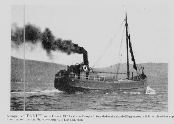 I'd heard tales about the Jennie being wrecked off the north end of Eigg and Mary and I went looking for the cave where we were told her remains had ended up. We could only get to it at low tide and what we found was the bow section of the ship wedged firmly into a sea cave. The story was that she stranded on the rocks off-shore and broke up. Some time later a heavy storm washed the bow section into the cave. This was in 1988 and I should think some of her still survives.