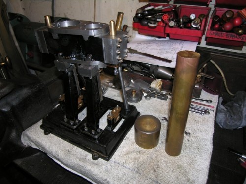 However.... Remember me saying that I wasn't impressed by the alignment of the LP cylinder on No. 2 engine? It became obvious when I fitted the piston and rod that there was something sadly amiss, it was well out of line. Not displaced sideways as I first thought but not running parallel with the bore. A word of advice. When something like this happens don't panic and start doing radical alterations, think carefully and logically. It can't be the bore out of parallel, you made sure of this when you set the block up for boring. Because I have made the pistons deliberately sloppy and the rods a good fit in the glands, the problem is going to be in either the central drilling in the bottom lid or the gland itself. I shall do a proper investigation this morning and find the cause. One decision I have already taken is to reduce the rods from 3/8ths to 5/16" as in the original design. Apart from the fact that they look a bit heavy for the size of the engine, this is no detriment because the seal is the packing in the gland nut and this will accommodate the reduction easily. The bore centres are, as far as I can see, just about perfect, all directly in line with the crosshed slides and this is the important thing. I shall have a good study this morning and report later! No despondency! These things happen, it's called fitting. All we need is a workable solution!