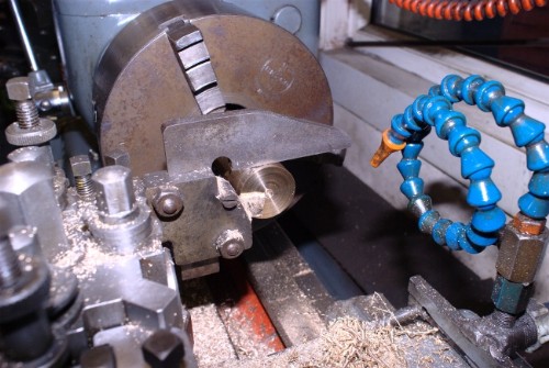 I think you can see the idea. The steady is bolted on the saddle and supports the stock with two copper plugs that can be adjusted. You only need two because the cut tries to lift the bar and force it backwards and these movements are restrained. Tail stock centre takes care of the back end and away you go. However, if it's a long bar....