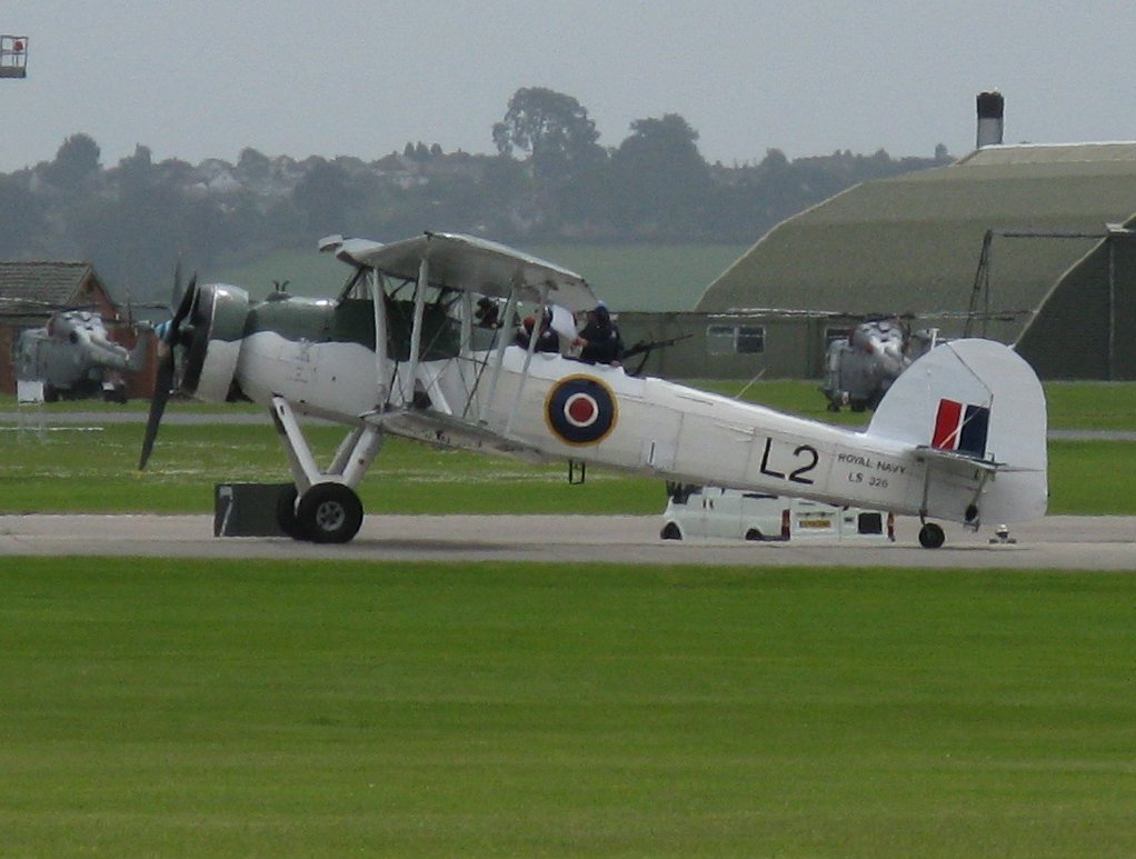 The Swordfish was not allowed to fly due to the bad weather but it was able to taxi along the runway. This is a long shot of it across the other side of the aerodrome. The Royal Navy Historic Flight owns three Swordfish, all of which are being returned to flight. This aircraft, LS326, was active in air shows between 1960 and 1999 but had not been seen in recent years owing to the need for refurbishment of the wings. The prototype Swordfish flew in 1934 and the type entered service in 1936.